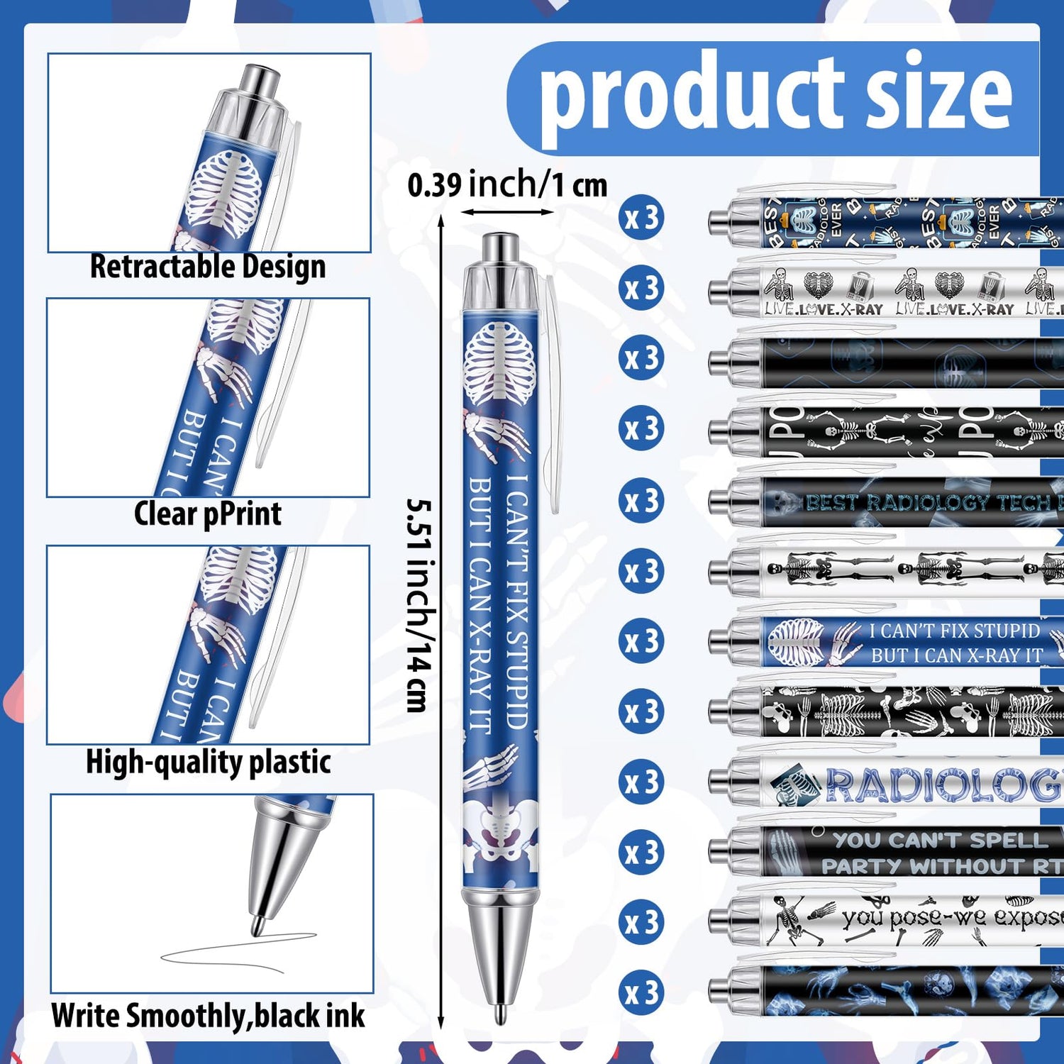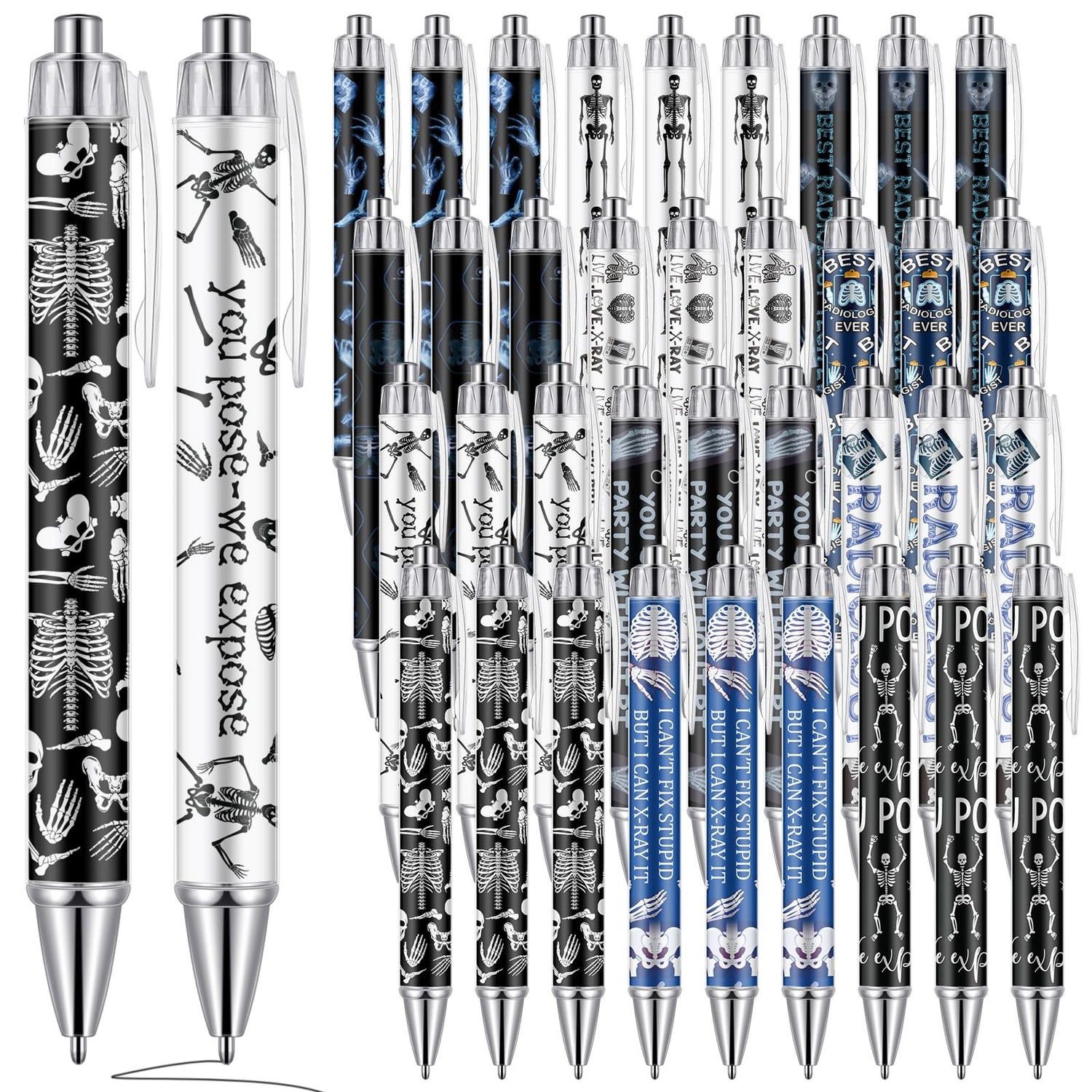 - Xray Tech gift Set: this X-ray tech gifts set includes 36 pens (12 unique X-ray tech designs) with smooth black ink refills; Perfect for daily writing and note-taking, with enough quantity to share with colleagues