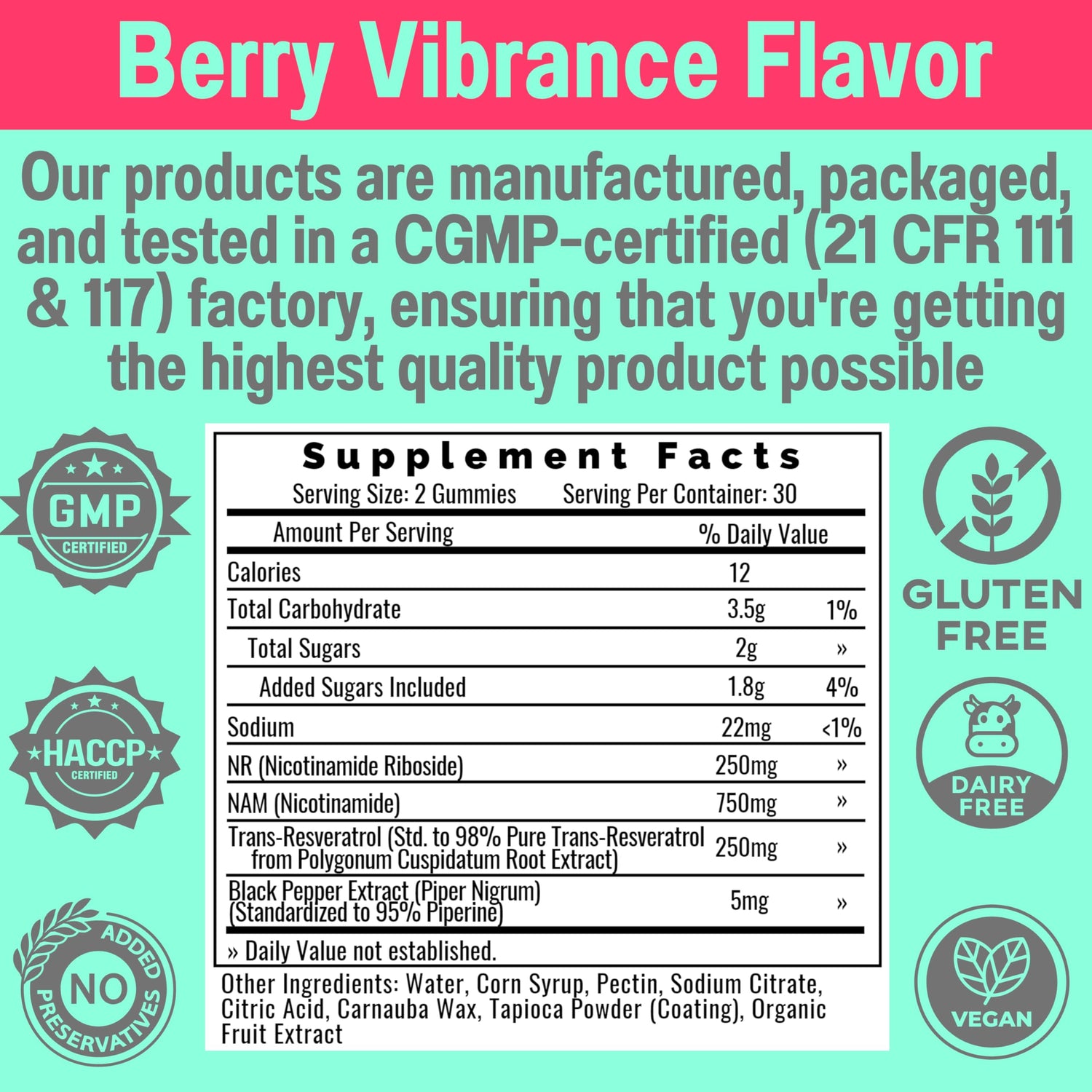 - Supercharge your cells with the power of NR and NAM! Our gummies contain a whopping 1000mg of NAD+ Boosting NR (250mg) plus NAM (750mg) per serving, supporting healthy aging and cellular energy production!