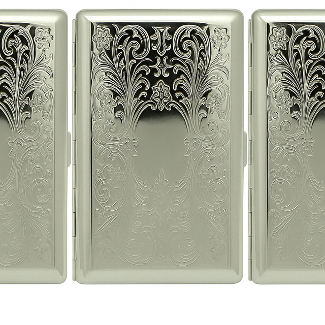 3 Pieces Silver Victorian Scroll (Half Pack 120s) Metal-Plated Cigarette Case & Stash Box with Mirror