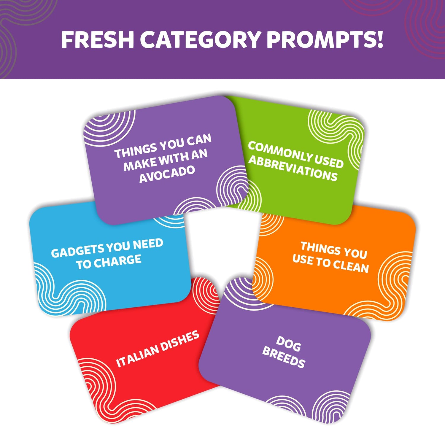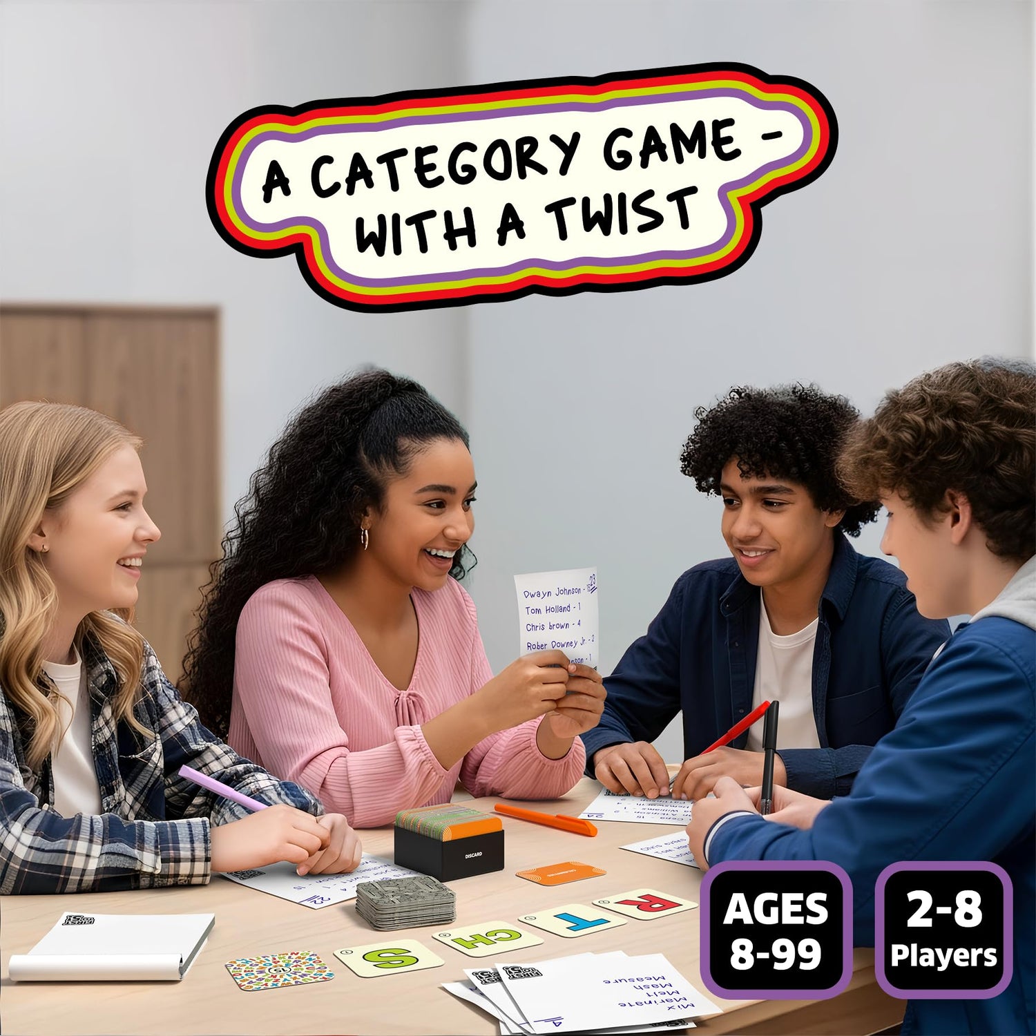 - INCLUDES: 200 Category Cards, 30 Letter Cards, 8 Pens, 1 Notepad, and an Instruction Manual.