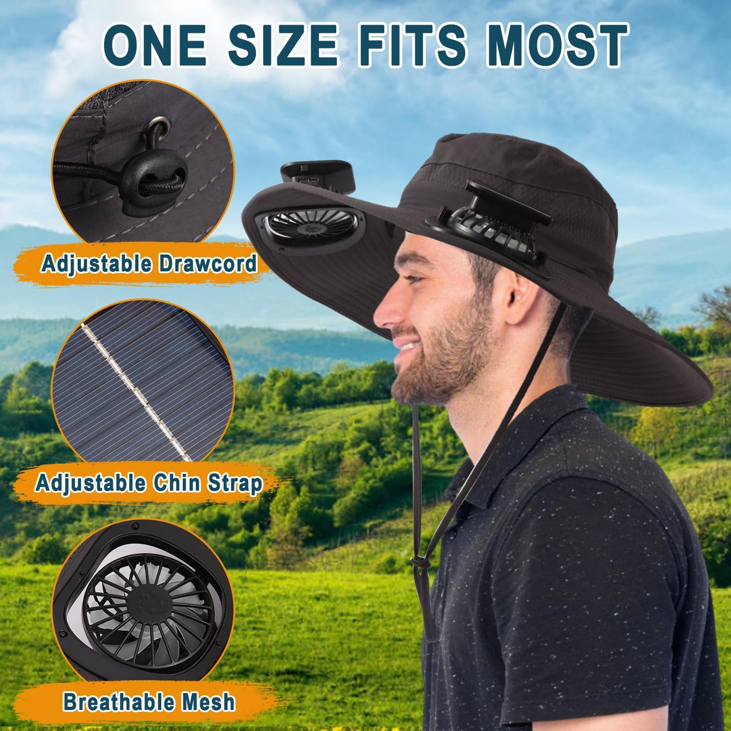 - 1.【Dual-Power Cooling System】 Harness solar energy or USB charging to fuel two built-in fans! The battery delivers 3-speed airflow (5-8 hours runtime), keeping you cool whether hiking, fishing, or gardening—no more sweaty discomfort under the sun