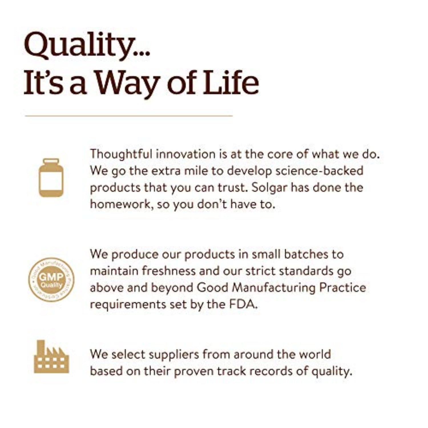 - The Gold Standard: For over 70 years, Solgar has been committed to quality, health, and well-being. Our mission is to create the finest nutritional supplements in small batches, through tireless research, using only the finest raw materials