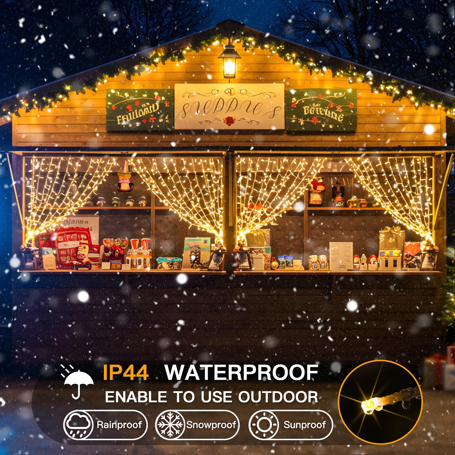 - [IP44 WATERPROOF/ SAFETY] The IP44 waterproof grade is adequate protection against rain and snow, which does not affect the outdoor Christmas waterfall lights. (Note that the USB is not waterproof.) Fairy lights and the USB will always keep a low temperature. It’s 100% safe to touch them.