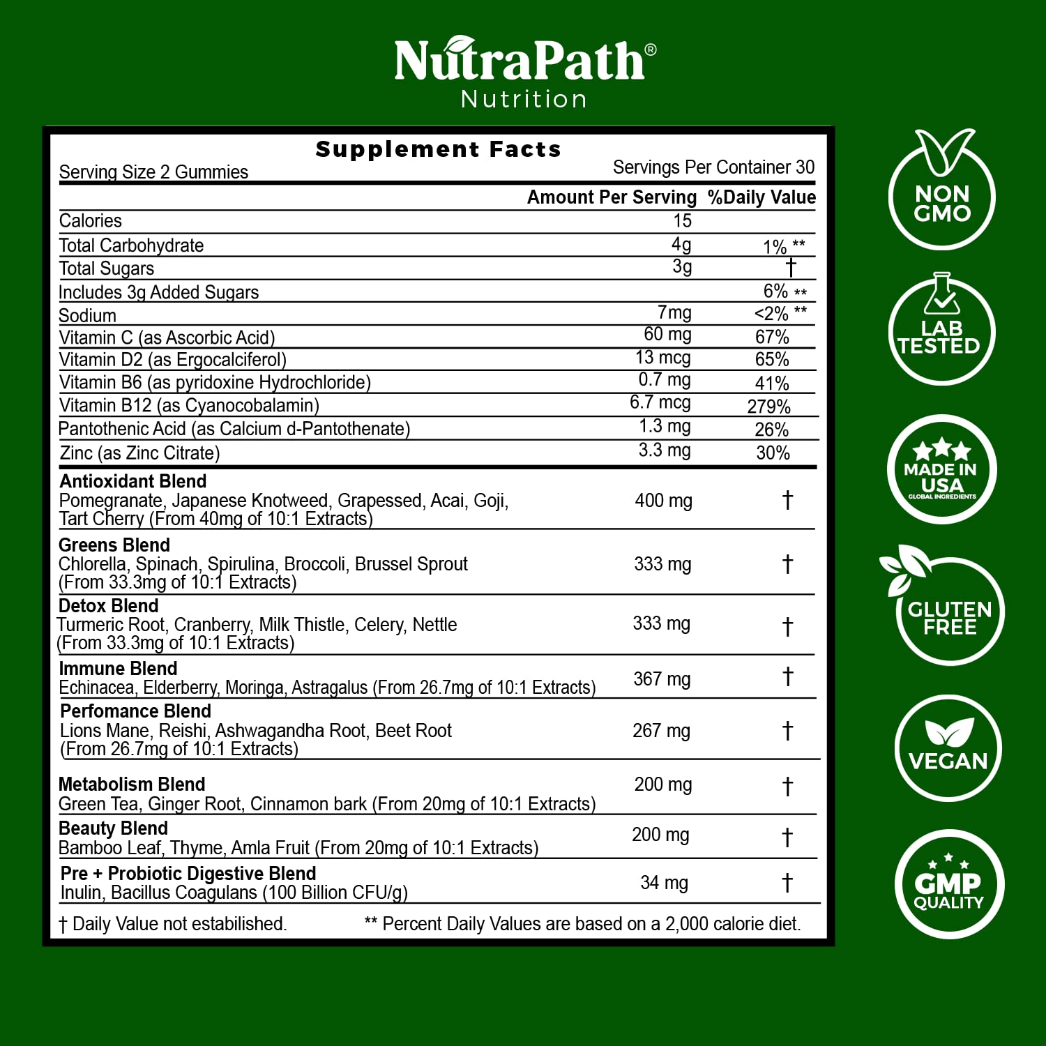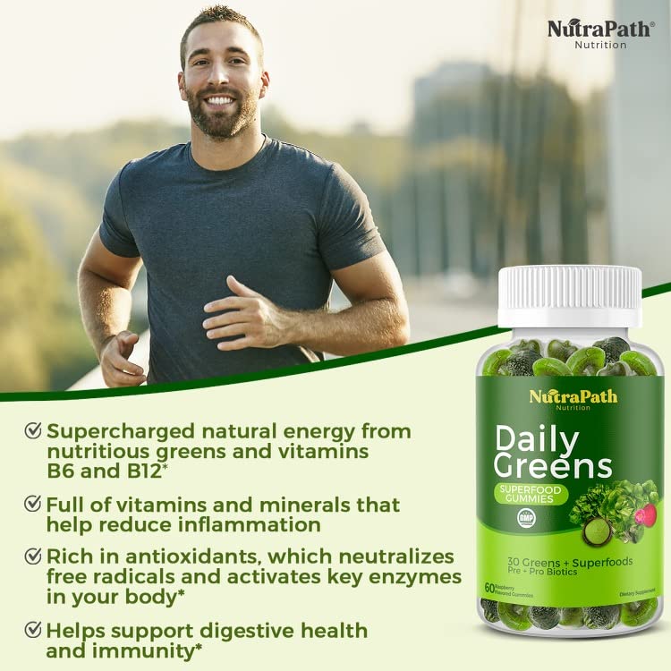 - Each NutraPath SuperGreens gummy is loaded with good-for-you superfoods and greens such as Pomegranate, Japanese Knotweed, Grapeseed, Acai, Goji, Tart Cherry, Chlorella, Spinach, Spirulina, Broccoli, Brussel Sprout, Turmeric, Cranberry, Milk Thistle, Celery, Nettle, Echinacea, Elderberry, Moringa, Astragalus, Lions mane, Reishi mushroom, Ashwagandha, Beet Root, Green Tea, Ginger, Cinnamon Bark, Bamboo Leaf, Thyme, Amla Fruit, Inulin, and Bacillus coagulans.