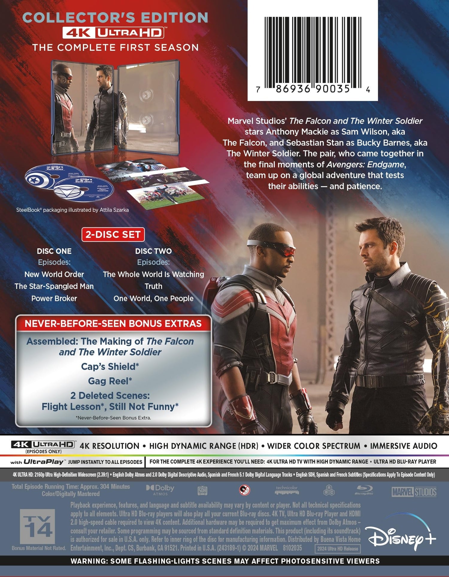 Details: Action-packed Disney+ MCU series follows unlikely partners Sam Wilson (Anthony Mackie) and Bucky Barnes (Sebastian Stan) as they go up against the anti-patriotic terrorist organization known as the Flag Smashers. The pair will also have to deal with John Walker (Wyatt Russell), the new government-appointed Captain America, whose methods and tactics don't align with his distinguished title. Erin Kellyman, Danny Ramirez, Daniel Brühl, and Emily VanCamp also star.6 episodes on 2 discs. 5 hrs. Widescreen; Soundtracks: English Dolby Atmos 7.1.4, DVS Dolby Digital stereo, French Dolby Digital 5.1, Spanish Dolby Digital 5.1; Subtitles: English (SDH), French, Spanish; featurette; gag reel; deleted scenes; documentary.