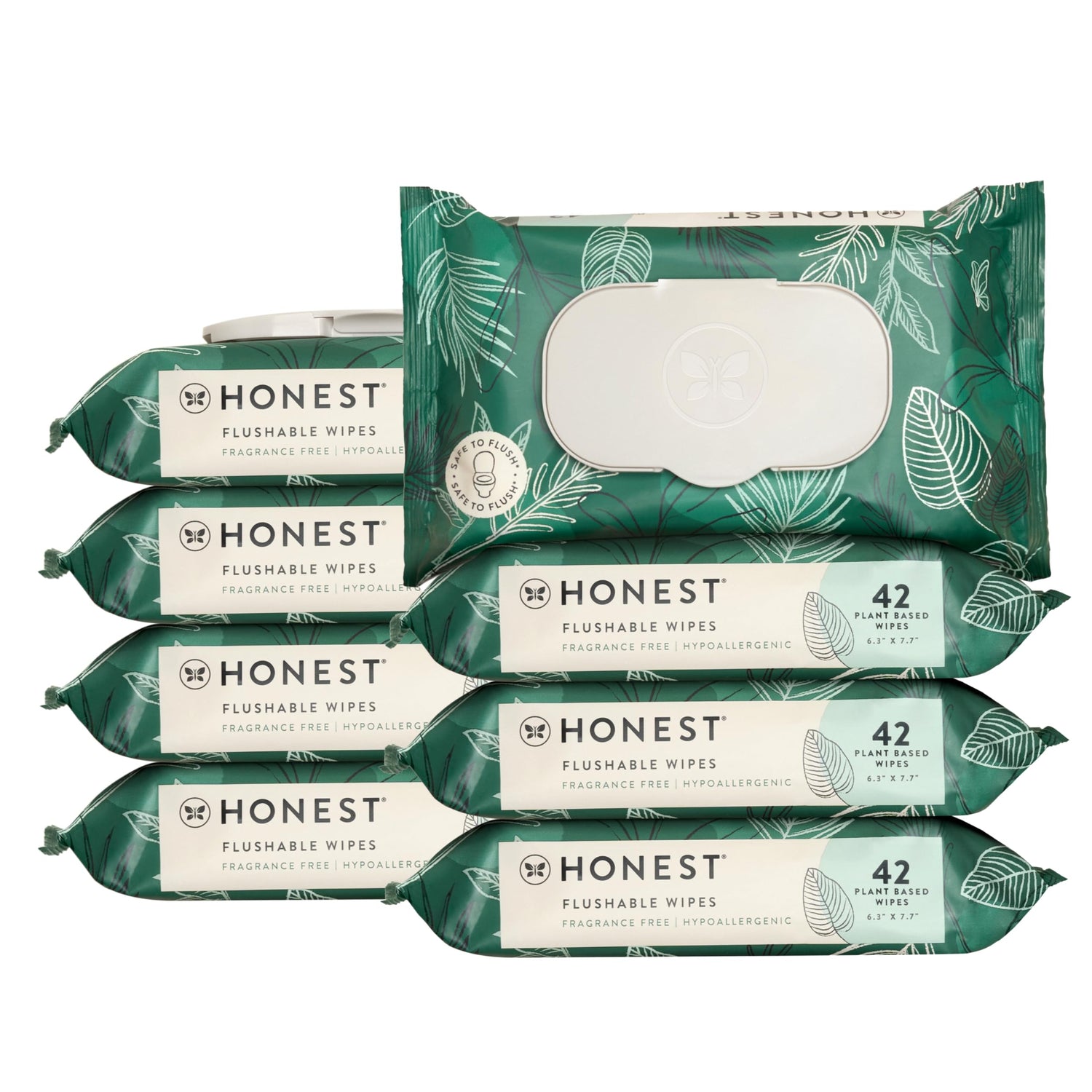 Details: Worry-free flushing! Our fragrance-free, Flushable Wipes with plant-based cloth work to elevate your bathroom experience. These soft and safe to flush wipe cloths begin to break down as fast as toilet paper and have the same break up at 30 minutes. Our flushable wipes are hypoallergenic, dermatologist + gynecologist tested, and pH Balanced so they don't disrupt your natural pH (down there). Made with over 99% water and made without PEGs, quats, fragrance, chlorine processing, BZK, and other questionable ingredients - for an Honestly clean flush! *Honest Flushable Wipes are compliant with INDA GD4 and IWSFG2020 Flushability Guidelines, formulated for sensitive skin, and are toxicologist audited. Our plastic-free, plant-based wipes mean less microplastics in landfills + oceans, so we can build a better planet for the future.