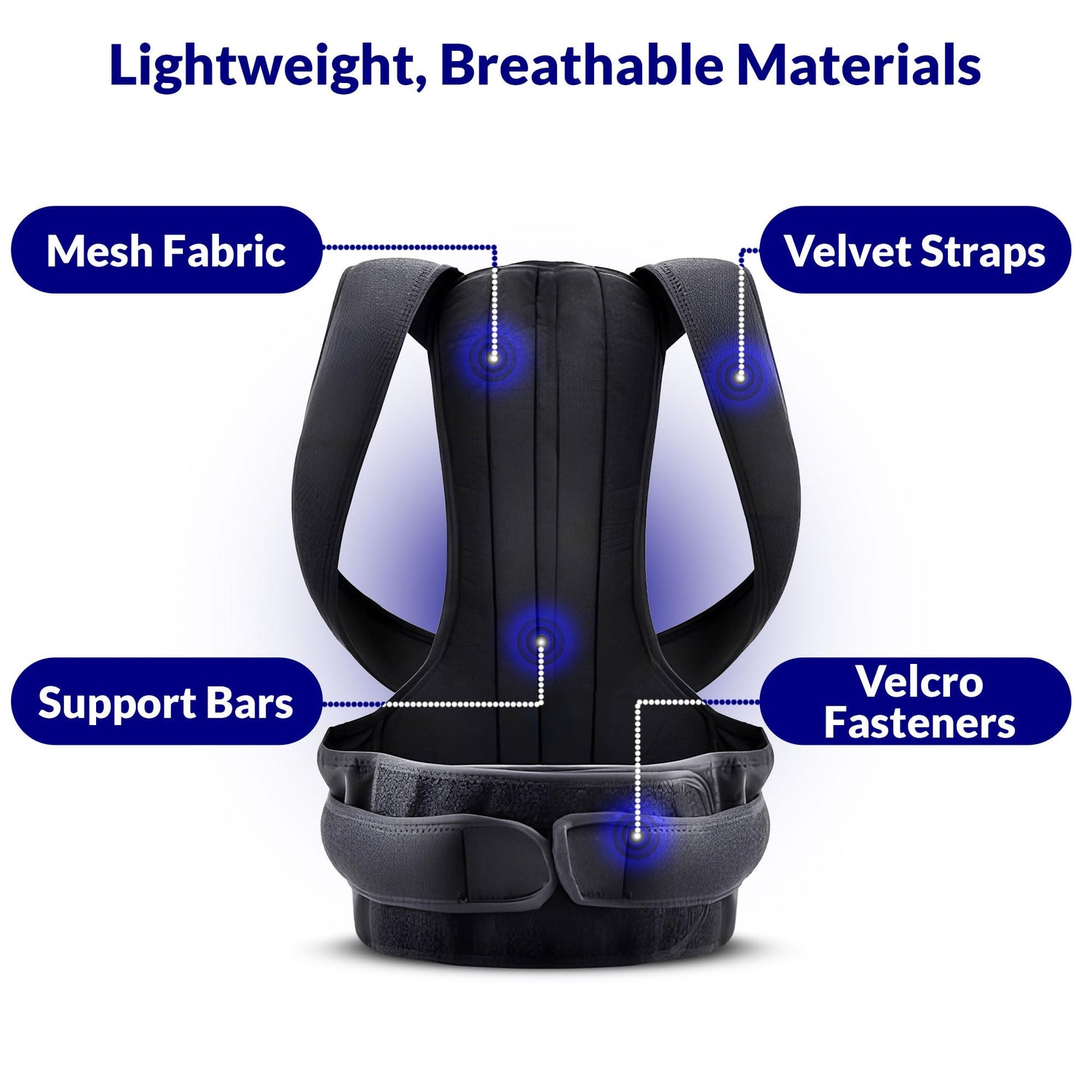 - All-Day Comfort - This shoulder straightener is made from breathable mesh fabric, wide soft velvet straps, velcro fasteners, and two support bars. These premium materials are Latex-free.