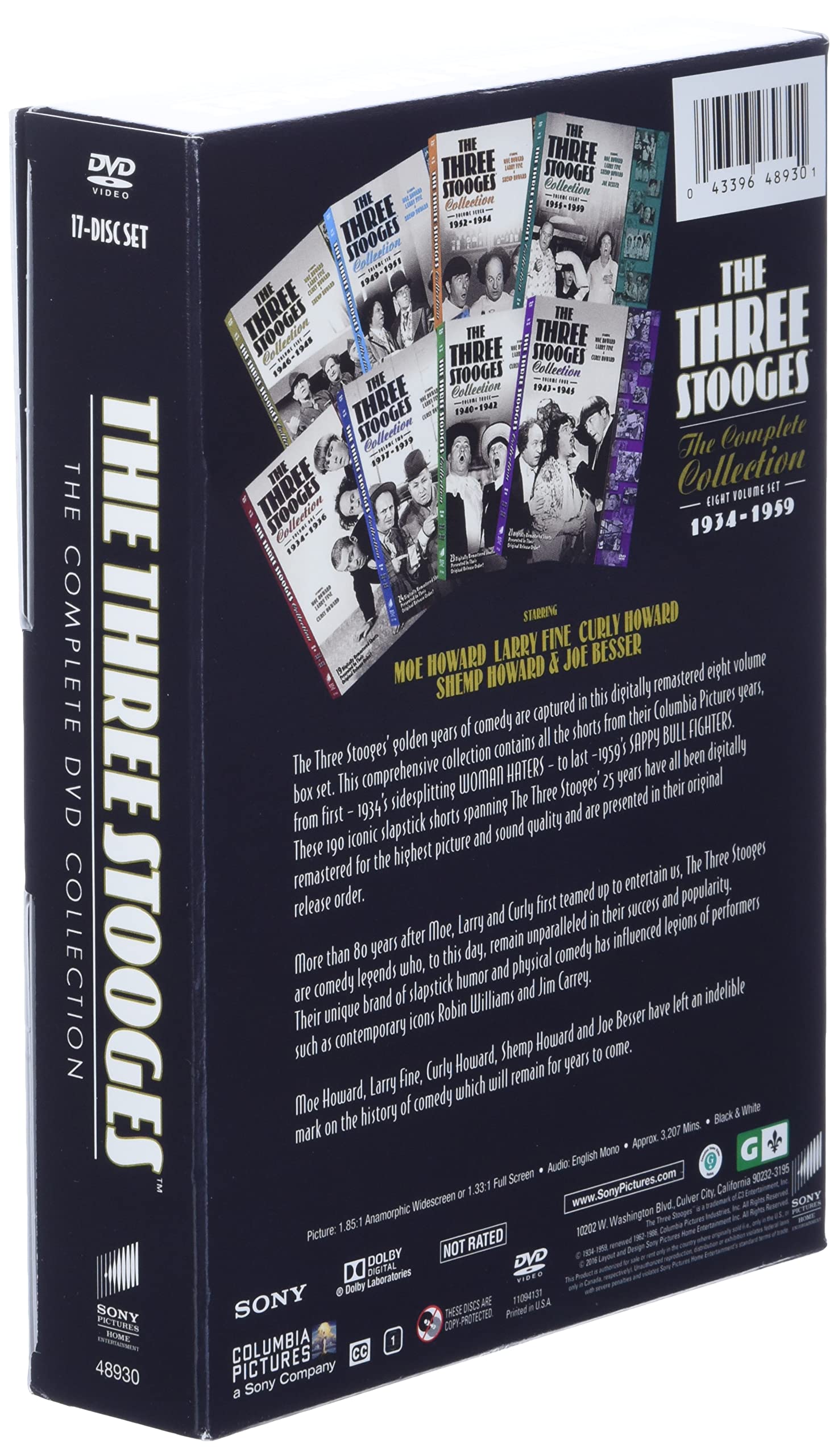 Details: Moe Howard, Curly Howard, Larry Fine. The three bumbling knuckleheads who delighted audiences both on stage and on screen for the first half of the twentieth century have 190short films collected here-from their screen debut Woman Haters (1934) to their last guffaw Sappy Bull Fighters (1959)-in incredible restoration! Larry, Moe and Curly bumble and stumble their way through this oversize collection of knee-slappers and slapstick classics. 190 short films on 17 DVDs. 1934-59/b&w/53 hrs., 58 min/NR/fullscreen & widescreen. The Three Stooges Collection" volumes 1-8 Standard/Widescreen (Enhanced); Soundtrack: English Dolby Digital mono; Subtitles: English (SDH).