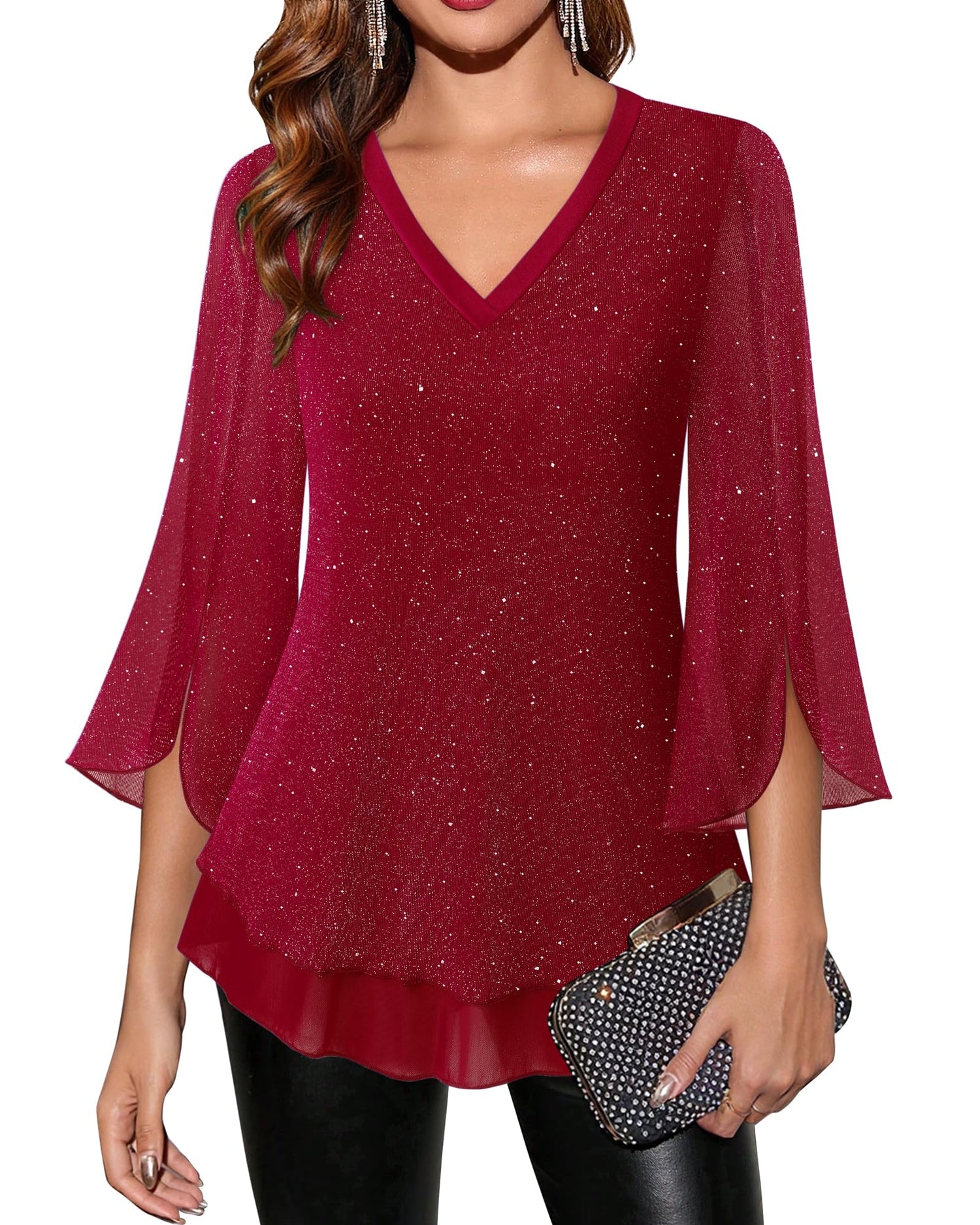 Timeson Womens Christmas Tops: Sparkly 3/4 Sleeve Night Out - Womens Blouses Dressy Casual - Fashion Fall Shirts Red Tunics Holiday Clothes Plus Size Date Outfits Fancy Festive Attire Loose Fit XL