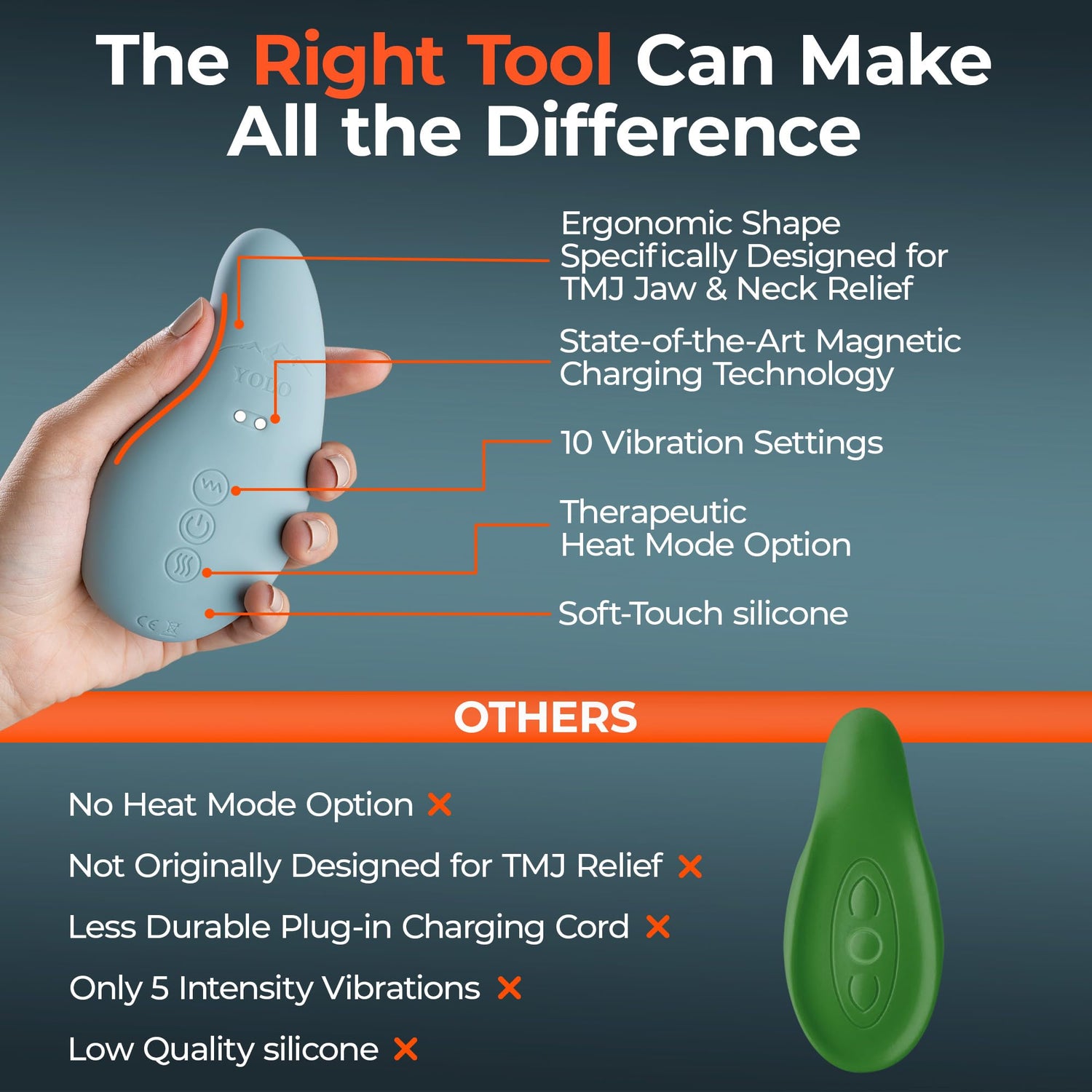 - DISCOVER TRUE RELIEF - YOLO Mountain Therapeutic has combined the proven TMJ Relief method of gentle vibration massage with the option of soothing Heat, into one unique device specifically designed for comfortable, effective TMJ symptom relief