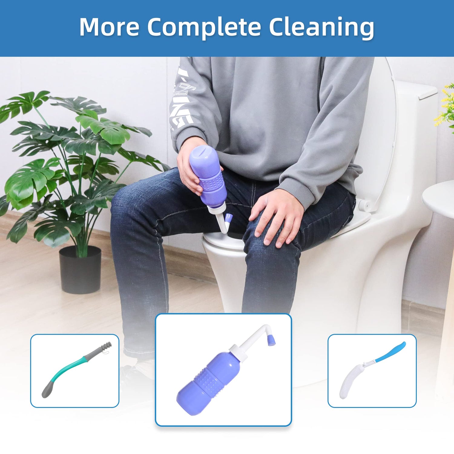 - 【Affordable 4 Piece Set】The package includes a curve handled brush, portable bidet, toilet aids for wiping and a storage bag. Compared with purchasing separately. This kit has a more affordable price.