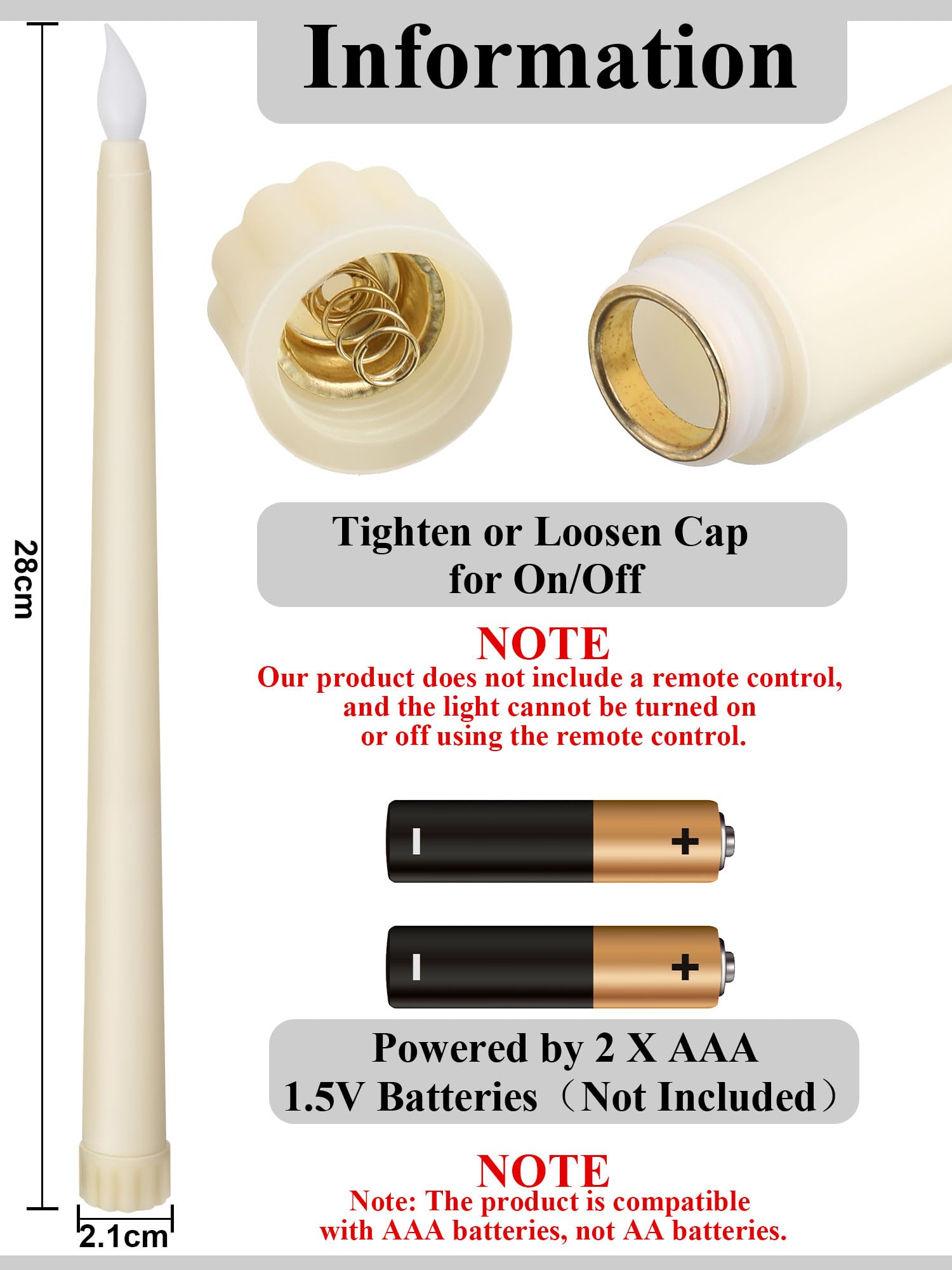 - Ideal Decorative Candles: each flickering flameless candle measures 0.8 x 11 inch, suitable for all standard and glass taper candlesticks, can be noticed easily, each LED candle need 2 AA batteries (not included in package), easy to replace