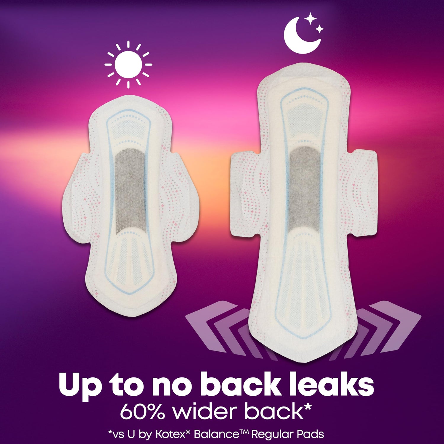 - Larger Back and Front: Each overnight absorbency pad comes with a larger front and 60% larger back.** Up to zero front, side or back leaks (**vs. U by Kotex Balance Regular Absorbency Pads)
