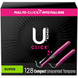 Details: Get up to 100% leak-free protection and stay confident throughout your day with U by Kotex Click Compact Tampons! Made without fragrance, Click tampons for women are designed for your comfort and have a smooth tip for easy and comfortable insertion. Each tampon features ComfortFlex grooves that move with y ou for outstanding comfort. Try U by Kotex Click Tampons and see why the #1 compact tampon* is chosen by women every 1.9 seconds. Pocket-sized and small enough to carry in your purse or pocket, these tampons go from compact to a full-size tampon in one easy step giving you comfortably compact, powerful protection. Pull the lower half of the tampon and when it locks in place, it’s ready to go! U by Kotex Click Compact Tampons are available in regular, super and super plus absorbencies. For backup period protection, try U by Kotex Barely There Pantiliners. U by Kotex feminine products are FSA/HSA/HRA-eligible in the U.S. Packaging may vary from images shown.*Based on sales data**Among those with a preference