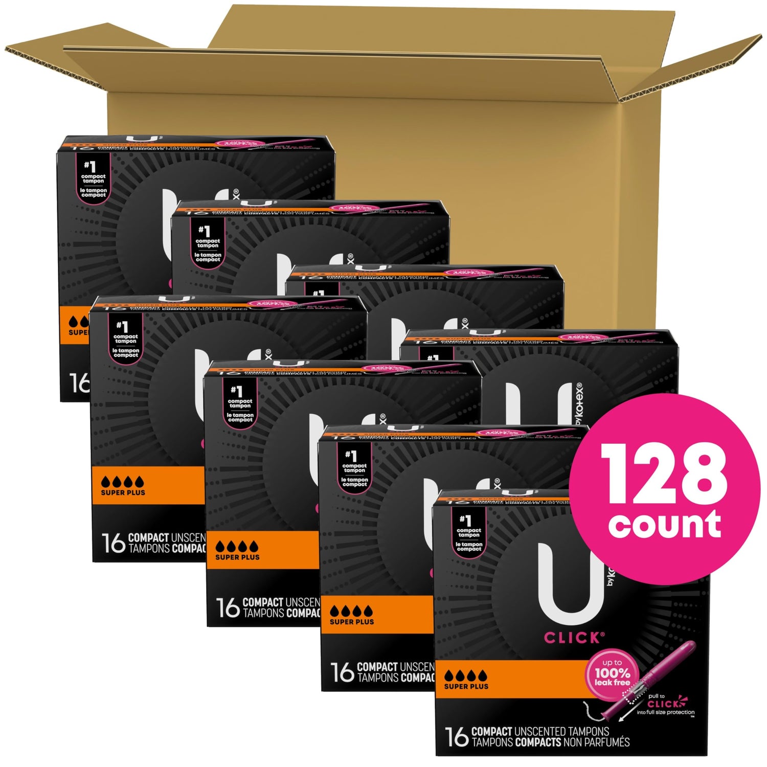 U by Kotex Click Compact Tampons, Super Plus Absorbency, Unscented, 128 Count (8 Packs of 16) (Packaging May Vary)
