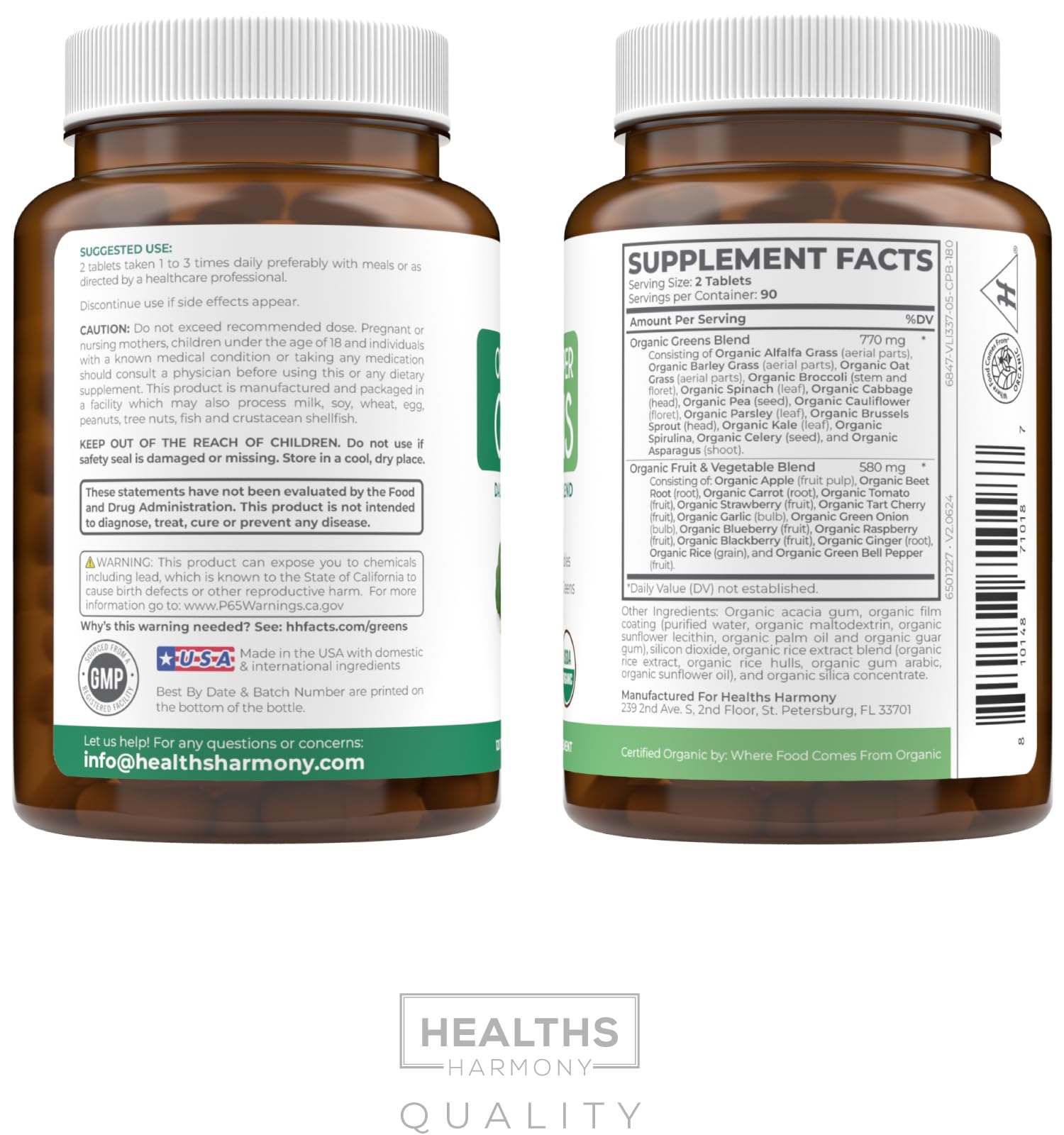 - Add to Cart Today: Healths Harmony Organic Super Greens powder tablets are USDA Certified Organic and made in the USA at a GMP-certified facility to maintain the highest standards of quality and potency.