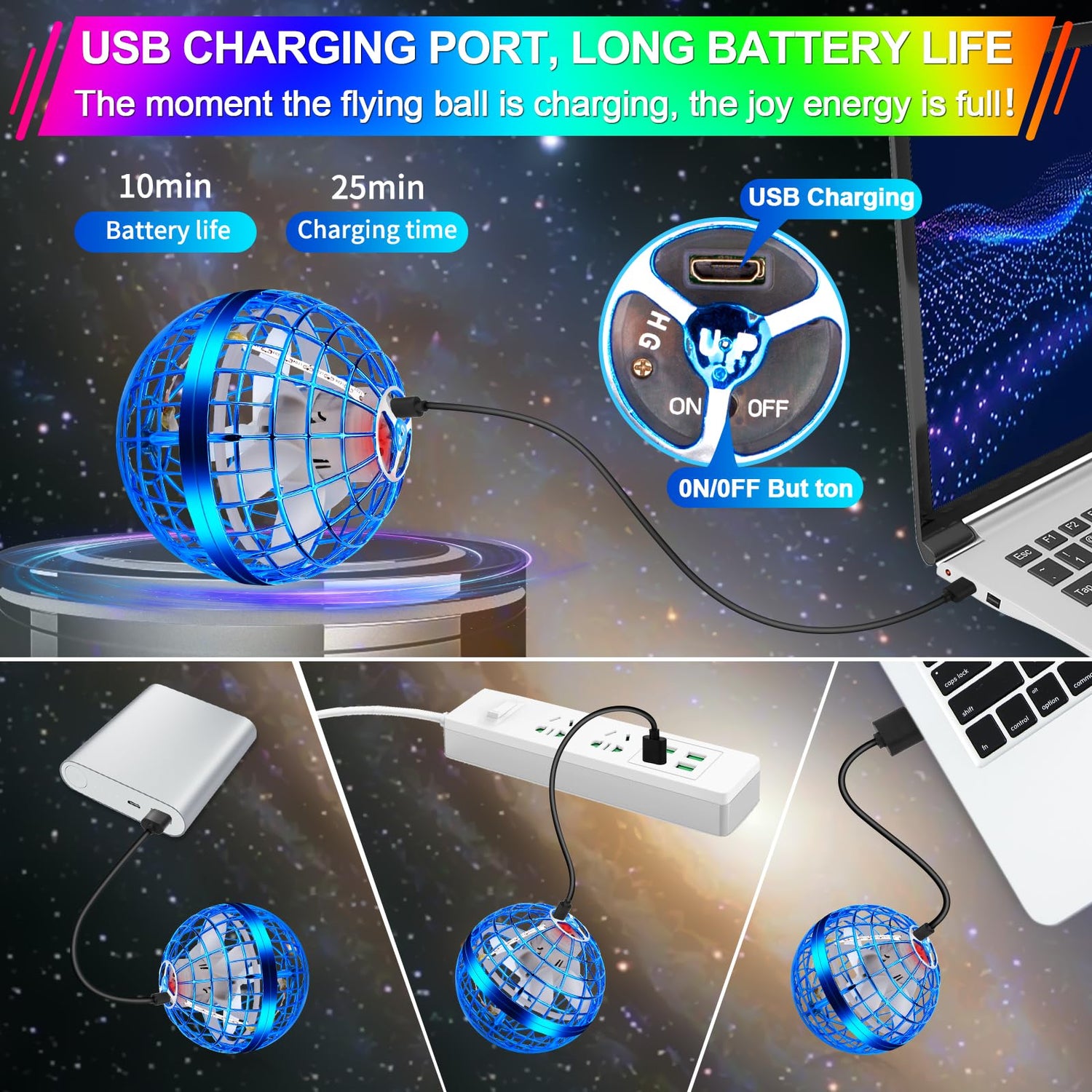 - Fantastic LED Color Lights and Charging Tips: Boomerang flying ball has built-in LED lights, the flying ball can infinitely change color while in flight, the colors are bright and look like neon shooting stars. Our magic flying parachute toy can be charged through any USB port. It takes only 25 minutes to charge and you can enjoy the fun of the hover ball. When the LED is flashing, the flying sphere ball must be charged. The LED is always on while charging and goes off when charging is complete