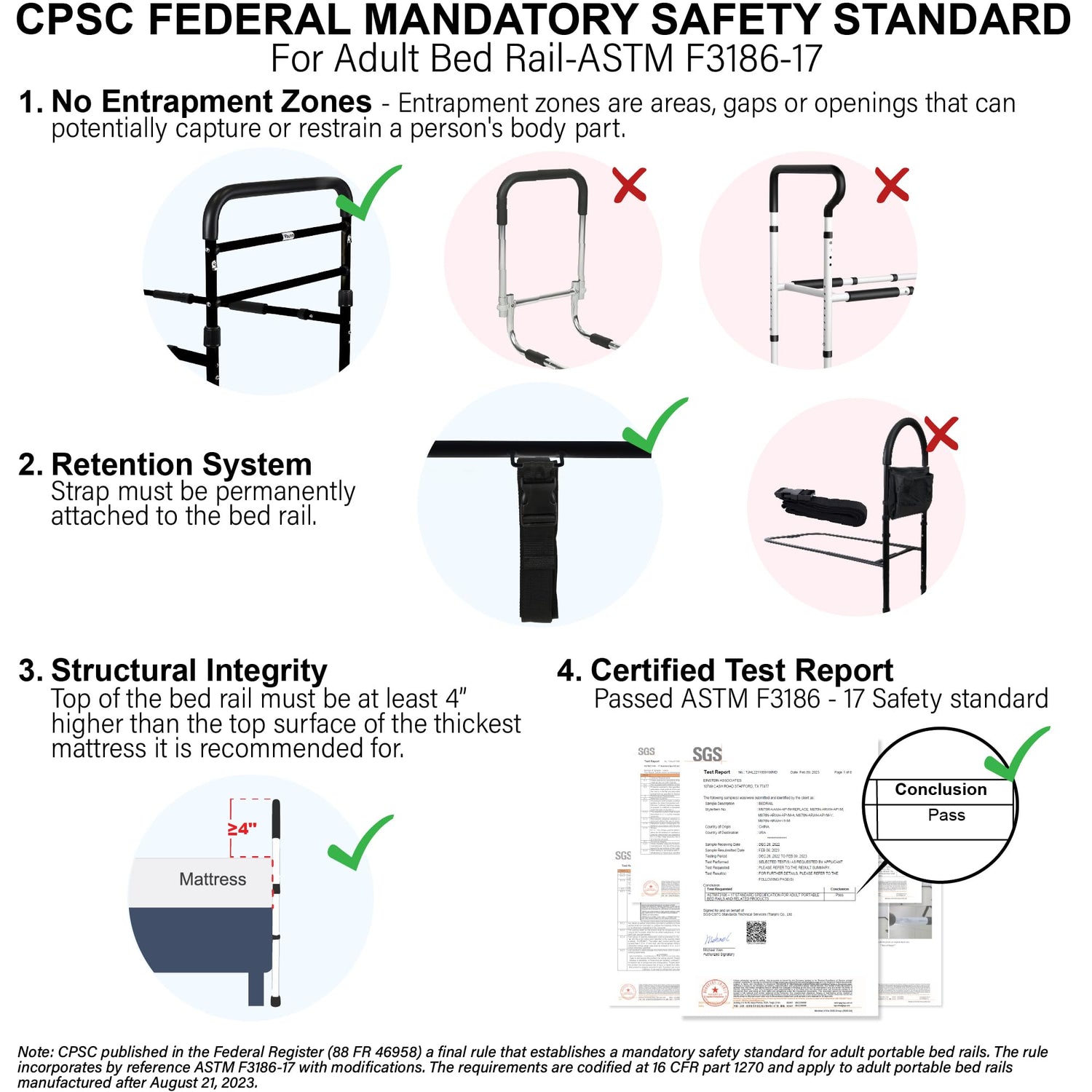 - FALL PREVENTION & MOBILITY INDEPENDENCE - Our bed rail passed ASTM F3186–17 Safety Standard Specification for Adult Portable Bed Rails in compliance with CPSC. Use the bed rail as a safe and secure way for disabled individuals or anyone with limitations or injuries to get in and out of bed unassisted to perform daily tasks (eating, reading, working) without leaving the bed.