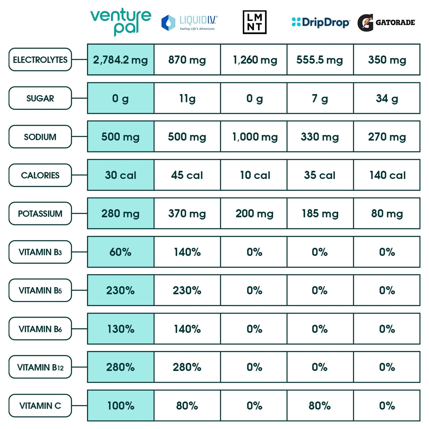 - SUGAR FREE AND OPTIMIZED FORMULA: Everyone knows that sodium plays a key role in maintaining fluid balance. However, most electrolyte mixes on the market are either too salty or too sweet. Venture Pal's Hydration Boost has zero sugar and an optimized sodium level within the daily value recommended by The American Heart Association
