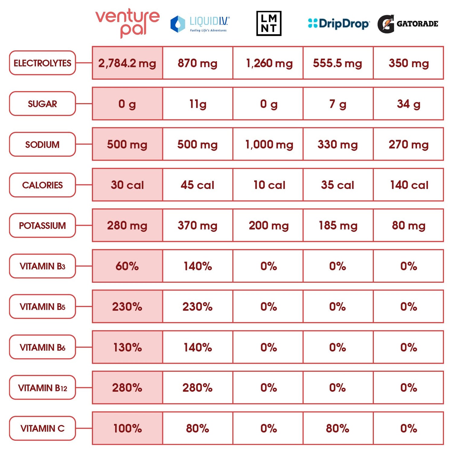 - SUGAR FREE AND OPTIMIZED FORMULA: Everyone knows that sodium plays a key role in maintaining fluid balance. However, most electrolyte mixes on the market are either too salty or too sweet. Venture Pal's Hydration Boost has zero sugar and an optimized sodium level within the daily value recommended by The American Heart Association