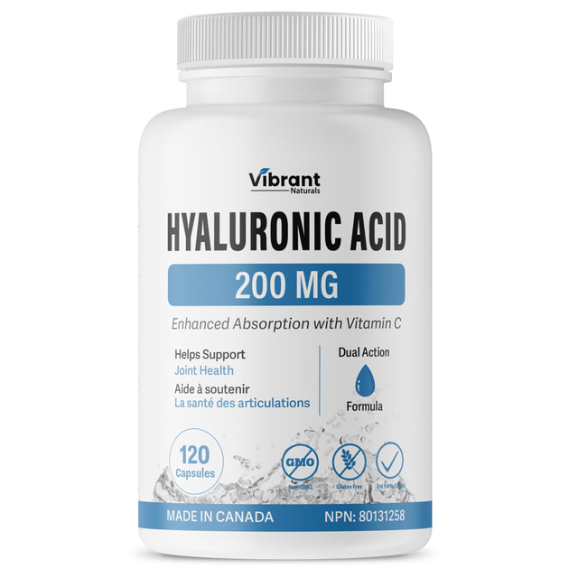 Vibrant Naturals Hyaluronic Acid Supplement 200mg - 120 Capsules, with Vitamin C 100mg, Joint & Skin Health, Non-GMO Fermentation, Gluten Free, Third Party Tested, Bioavailable Formula