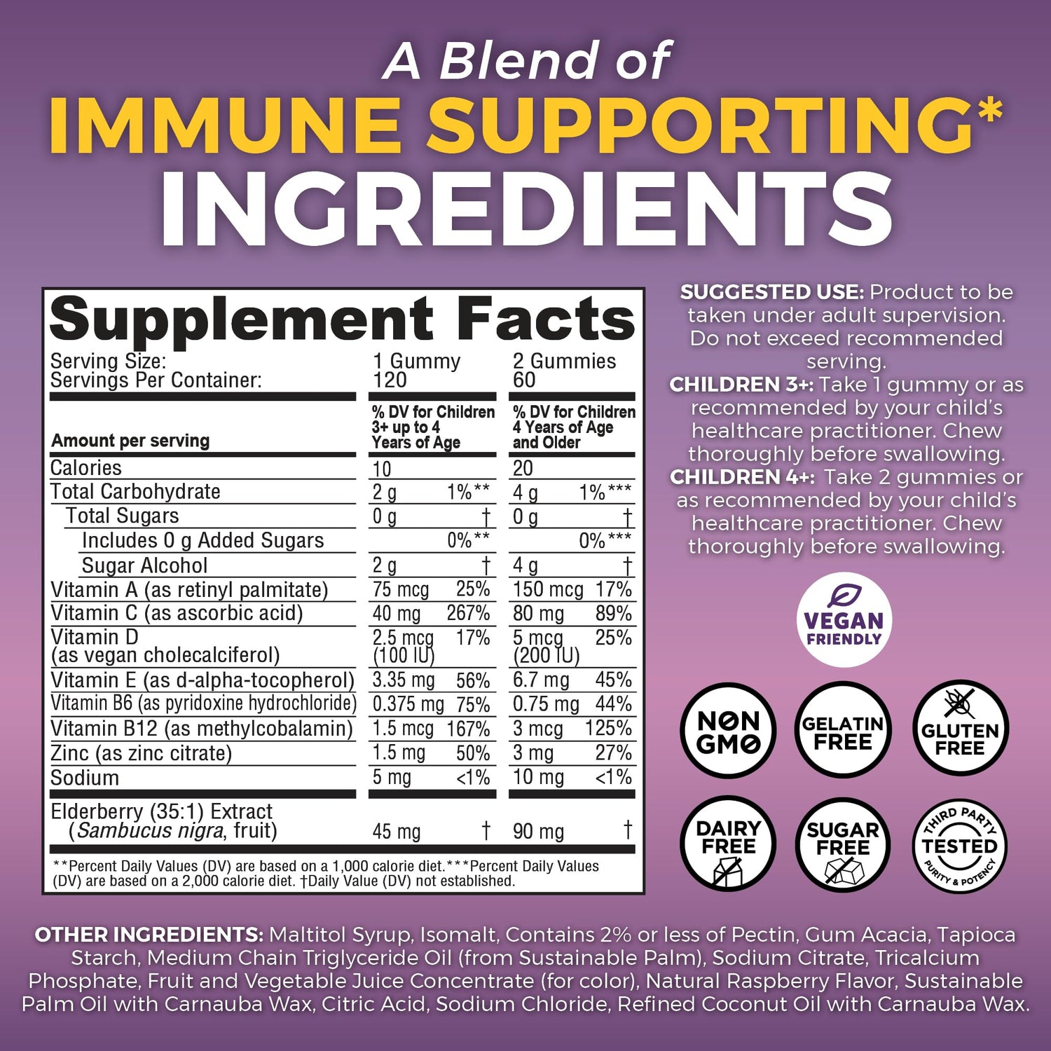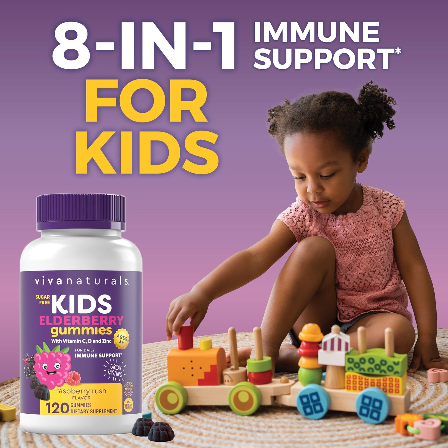- 8-in-1 Daily Immune Support for Kids*: Give your child daily immune support with our delicious, sugar-free elderberry gummies.* Our kids elderberry gummies deliver a comprehensive blend of Sambucus Elderberry, Zinc, and essential Vitamins A, C, D, E, B6, and B12 for year-round wellness.*