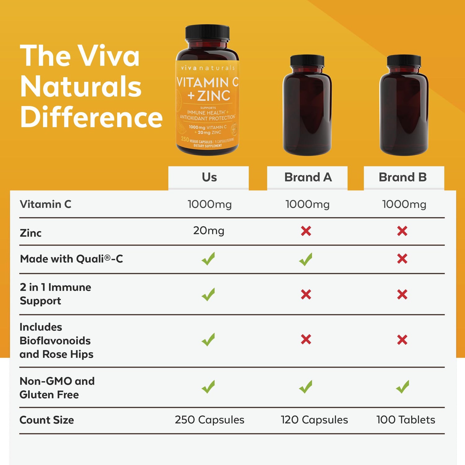 Viva Naturals Vitamin C and Zinc Supplement (250 Capsules) - 1000 mg Vitamin C with Zinc 20 mg Antioxidant Supplements for Immune Support, Vitamin Supplement for Adults