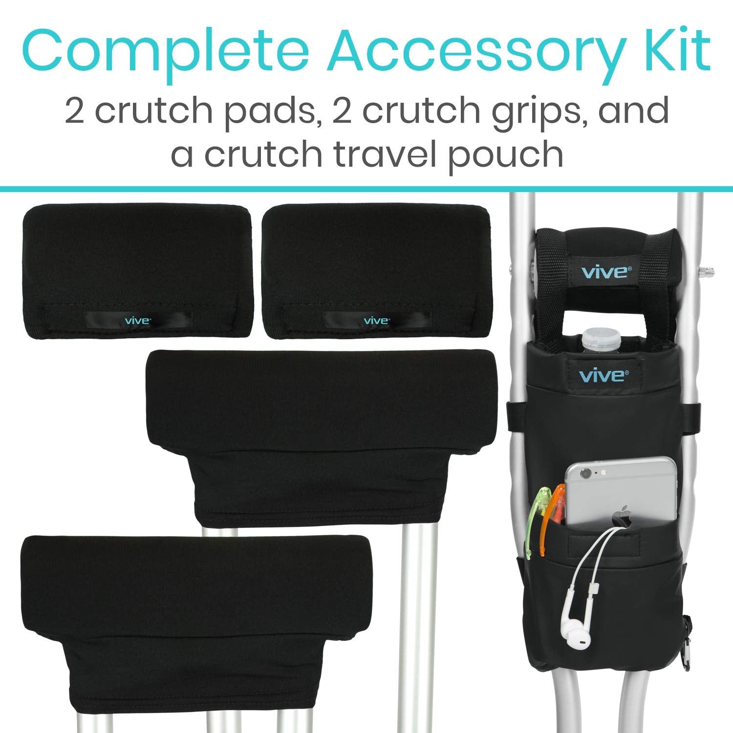 - COMPLETE CRUTCH ACCESSORY KIT: Making crutch use more comfortable, the five piece Vive crutch accessory kit includes two padded crutch pads for underarm comfort, two hand grips to relieve hand and wrist fatigue and a water-resistant crutch pouch for safely keeping essential items close at hand. Each piece of the crutch kit is designed to fit any pair of standard or youth-sized crutches.