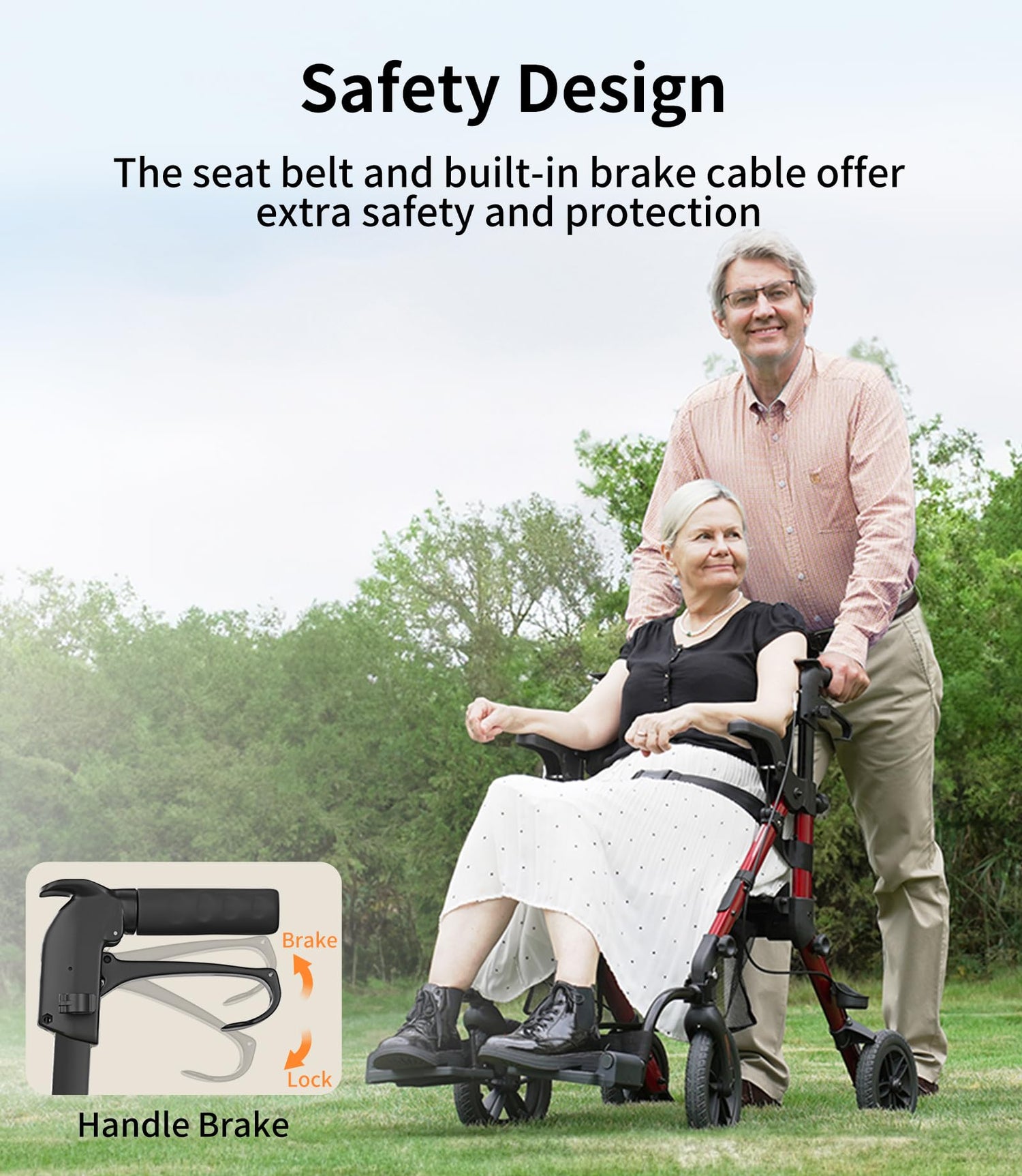 - 2 in 1 Rollator Walker for Seniors:Our 300Lbs Load Capacity Rollator-Transport Chair offers an innovative and practical solution that combines the mobility support of Walkers For Seniors With Seat and the comfort of a transport chair in a single product. This versatile design allows seniors to maintain an active lifestyle while ensuring they can take breaks and sit down whenever necessary, promoting independence and confidence in their daily activities.