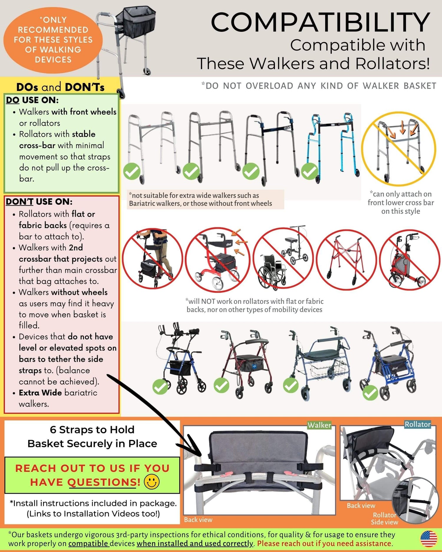 - Water-Resistant and Durable: Crafted from high-quality Oxford fabric with a special water-resistant backing, our walker pouch for folding walkers is built to withstand daily wear and tear. Keep your belongings safe and dry in all conditions, and enjoy the peace of mind that comes with long-lasting durability. This walker basket is your reliable companion for all your adventures.