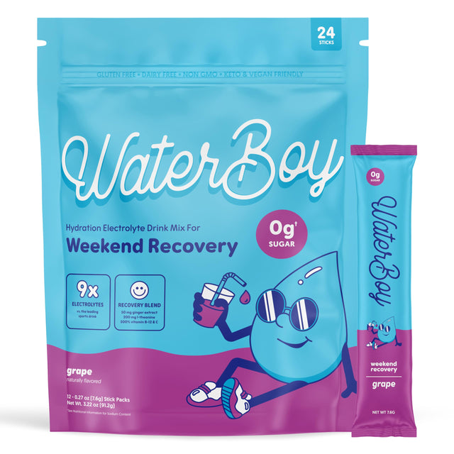 Waterboy Weekend Recovery | 3,187mg Electrolyte Powder Packets | Ginger + L-Theanine + Vitamins | No Sugar, All Natural, Gluten Free | 24 Drink Stick Mixes (Grape) is backordered and will ship as soon as it is back in stock.