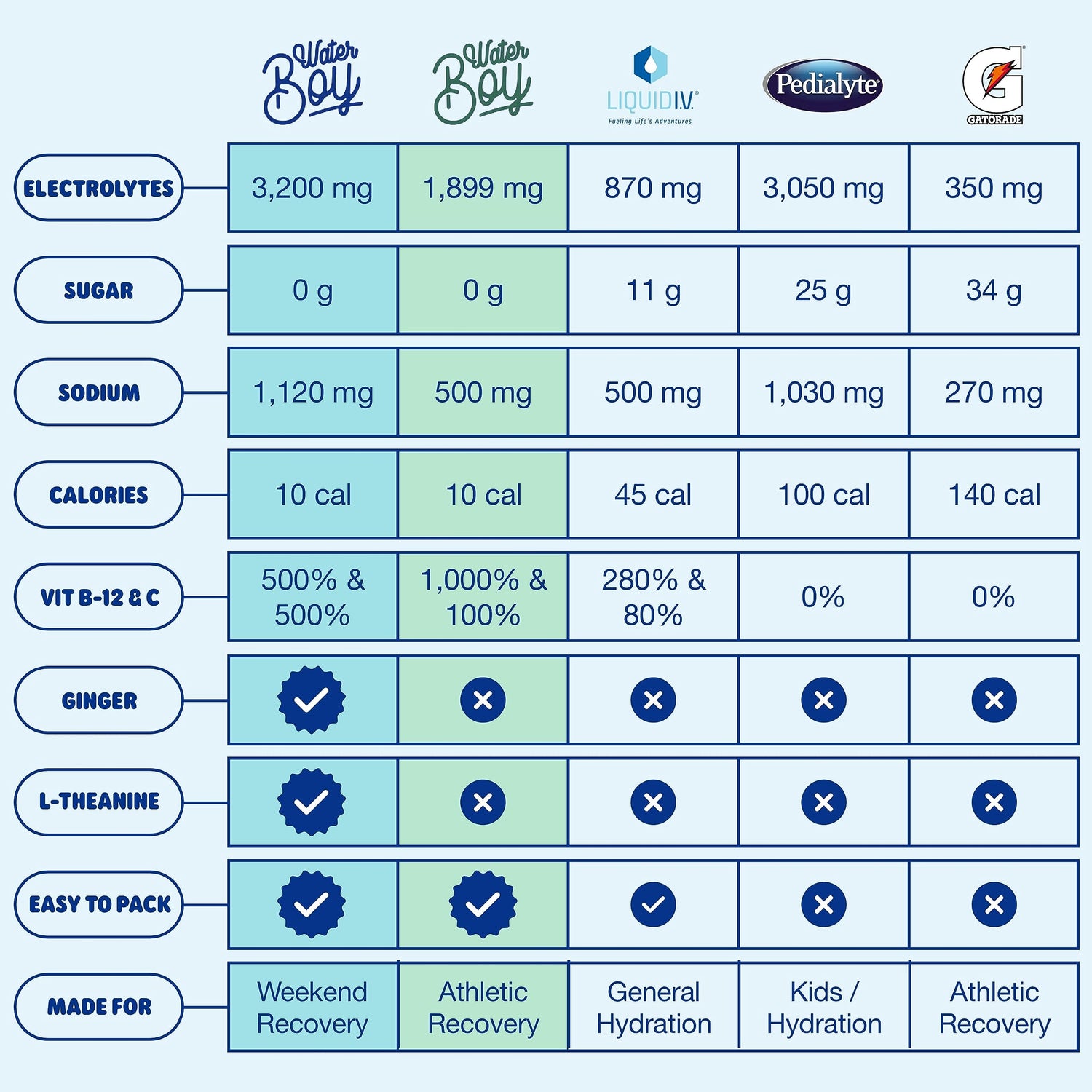 - MADE FOR ADULTS: Most electrolyte mixes and electrolyte drinks on the market are made for kids, general hydration or sports or and are LOADED with sugar. Waterboy weekend recovery is made specifically to help adults. Waterboy includes L-theanine, ginger and vitamins to help you bounce back faster