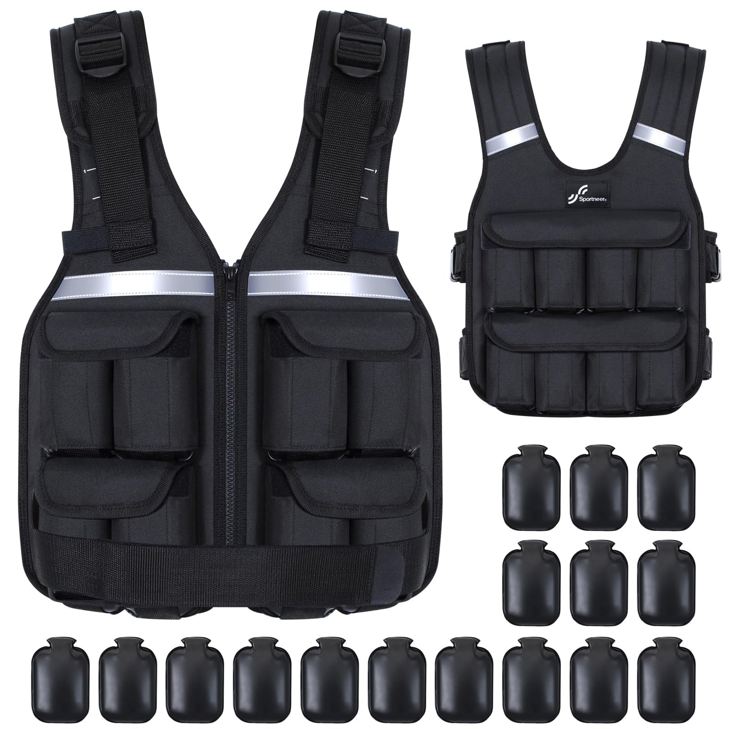 - Uniform and Adjustable Weight distribution: The Sportneer free adjustable running vest comes with 16 x 2.5 pound weight bags, eight evenly distributed front and back, and the vest itself weighs 2 pounds, allowing you to find the exact weight combination that best suits your training between 2-42lbs