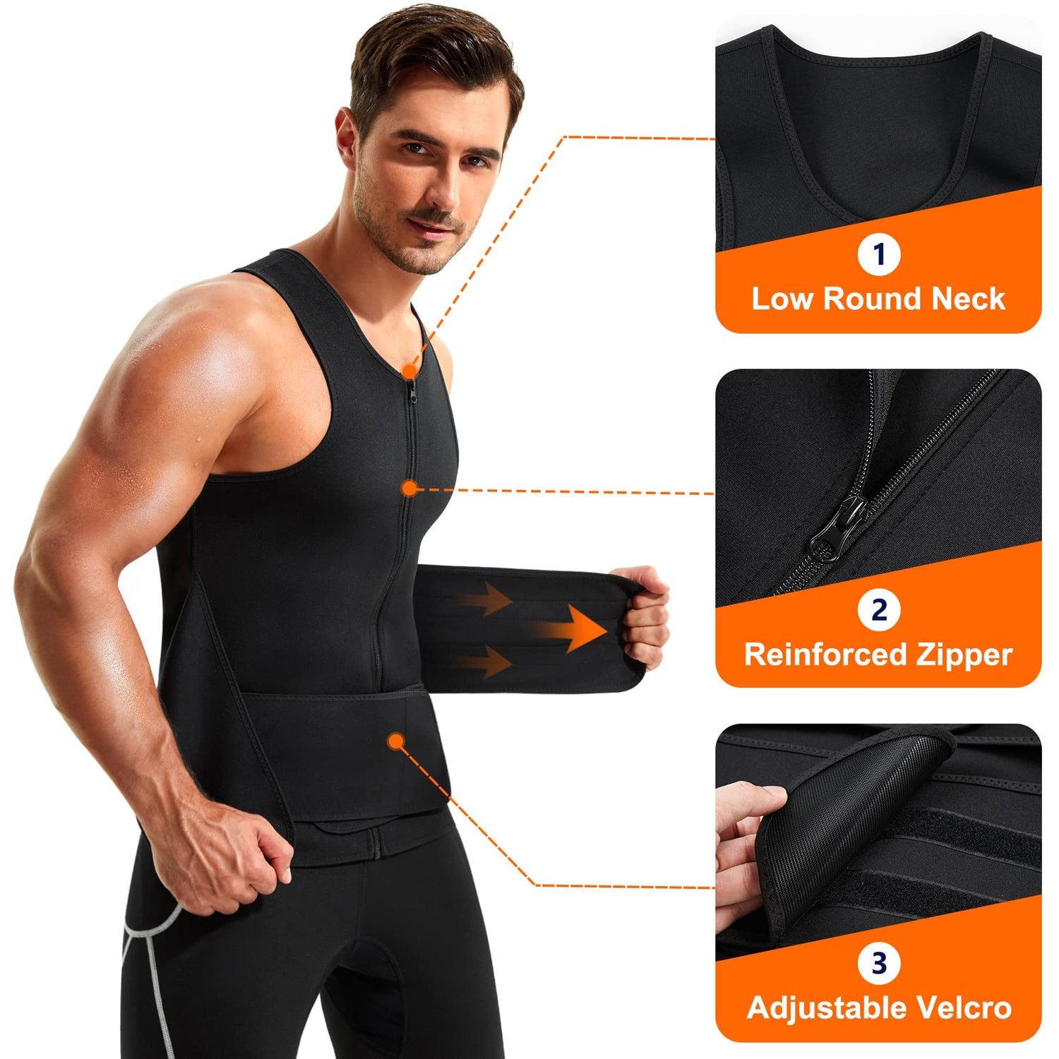 - EASY TO PUT ON AND TAKE OFF.The neoprene sauna vest for men is equipped with an upgraded zipper for on and off,and the sewing is strong enough that the waist trimmer belt on the sweat vest won't be ripped easily.The zipper has a protective back layer, so you won't pinch yourself during exercise.Zipper body shaper for men also fits comfortable under your shirt to burn extra calories and fat.It's the must in men hot sweat vest for you!