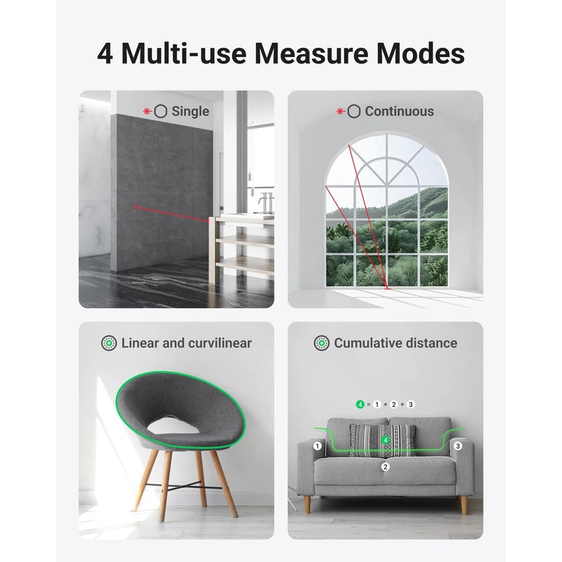 - 4 Multi-use Measure Modes: Provides diverse measurements including Single, Continuous, Linear and Curvilinear Measurement, and Cumulative Distance Measurement. A handy tool for construction work or furniture fitting.