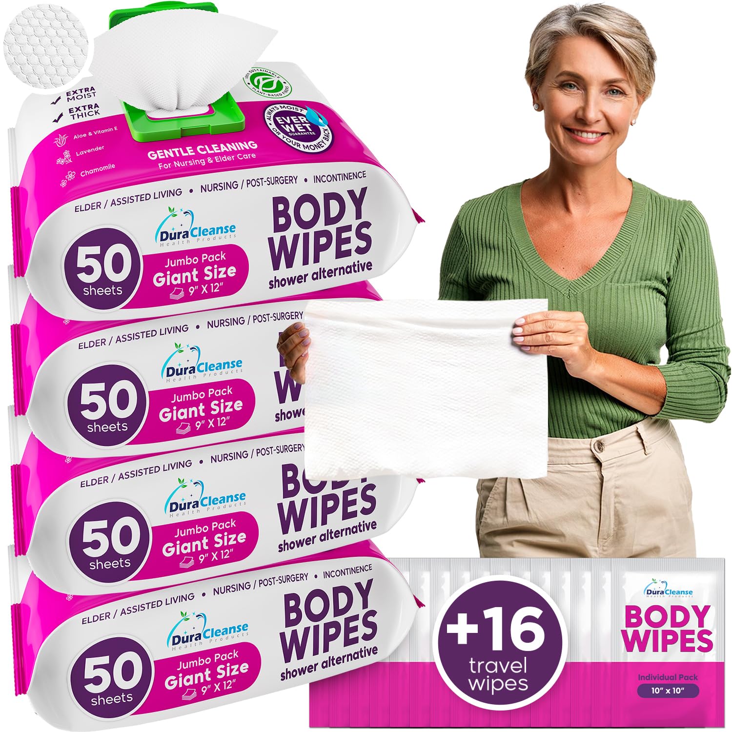 - Jumbo-Sized Adult Wipes: Our 200 Ct. + 16 Travel Wet Wipes for Adults are designed to provide a deep cleansing experience. These 9"x12" extra thick, extra moist, and extra large adult wipes ensure complete coverage, making them ideal for personal care. Our body wipes for adults bathing -no rinse, are a great addition to any collection of health care products and emergency supplies. Our body cleansing wipes for adults are highly rated and super-effective.