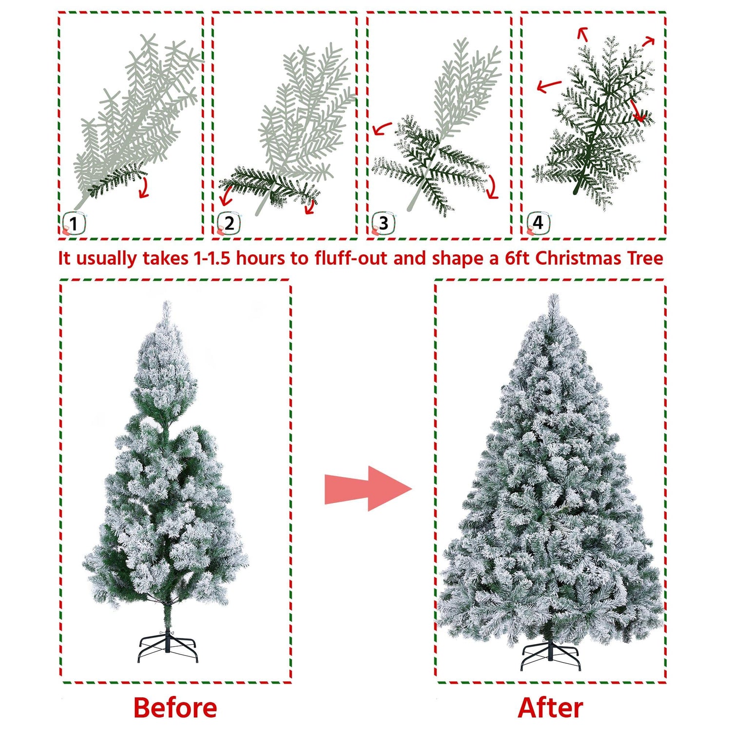 - Snowy Look: The Christmas tree features lush green branches covered in white flocking, creating a stunning snowy white and green appearance that adds a magical winter atmosphere to your holiday decor; Assembled Dimensions: 47.2″ Dia. × 72″ H
