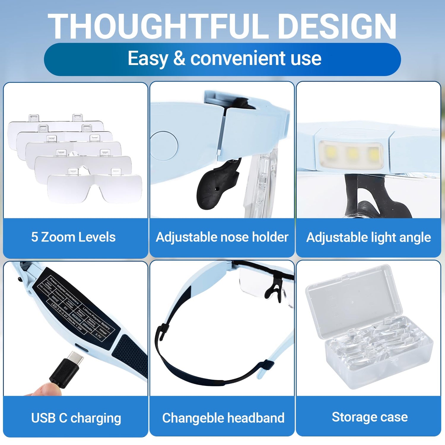 YOCTOSUN Magnifying Glasses with 3 LED Lights, Magnifying Headset with 5 Detachable Lenses 0.75X,1.25X,2.0X,3.0X and 4.0X, Headband Magnifier for Close Work, Hobby Crafts