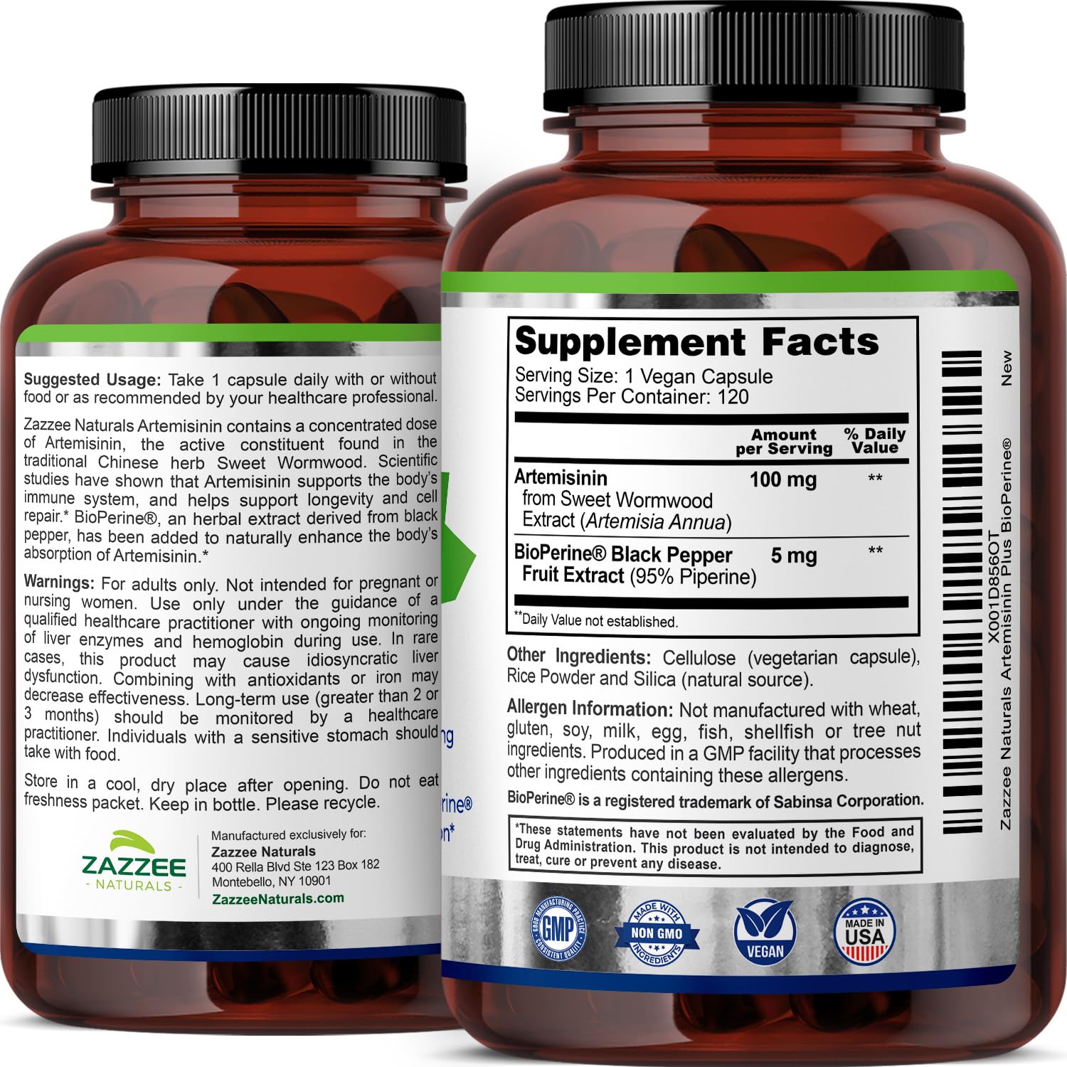 Zazzee High Absorption Artemisinin, 100 mg per Capsule, 120 Vegan Capsules, with 5 mg BioPerine for Maximum Absorption, Sweet Wormwood Extract, 4 Month Supply, All-Natural and Non-GMO
